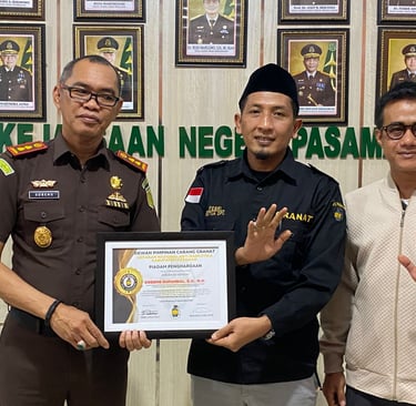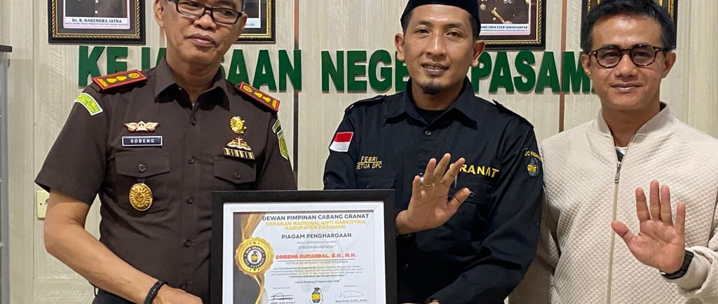 Lubuk Sikaping, 29 September 2025 - Dewan Pimpinan Cabang (DPC) Gerakan Nasional Anti Narkotika (Granat) Kabupaten Pasaman telah memberikan penghargaan kepada Kepala Kejaksaan Negeri (Kejari) Kabupaten Pasaman, Bapak Sobeng Surandal, S.H, M.H. Penghargaan ini diberikan sebagai bentuk pengakuan atas dedikasi dan dukungannya terhadap kegiatan Granat dalam memberikan edukasi tentang bahaya narkotika kepada masyarakat serta generasi muda.